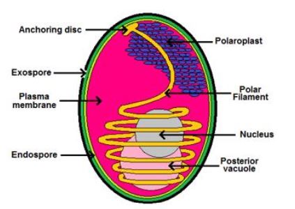Bào tử EHP được bao bọc bởi 3 lớp gồm ngoại bào tử, nội bào tử và màng sinh chất (vì vậy rất khó tiêu diệt). Bên trong chứa cực quang, đĩa bám, sợi cực, không bào và vật chất di truyền.